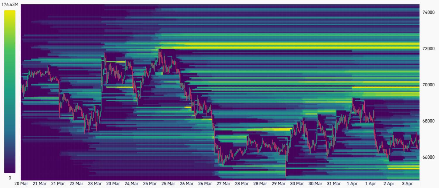 از روز پنجشنبه ۱۳ فروردین که بیت کوین با سقوط قیمتی به زیر ۶۸ هزار دلار رسید، نوسانات قیمت در محدوده ۶۶ و ۶۷ هزار دلار ادامه دارد. بااینحال، با گذر زمان به نظر میرسد که با وجود مشاهده مقداری فشار خرید بیت کوین، حفظ ۶۷ هزار دلار برای بیت کوین دشوار شده است و قیمت به سمت ۶۶ هزار دلار حرکت داده میشود.