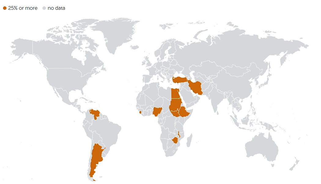 مرور تجربه کشورهایی که با ابرتورم روبهرو شدهاند، میتواند درک روشنتری از پیامدهای آن و درسهایی برای جلوگیری از تکرار این بحران ارائه دهد. در تصویر زیر، کشورهایی با بالای ۲۵ درصد تورم سالانه تا سال ۲۰۲۴ مشخص شدهاند: