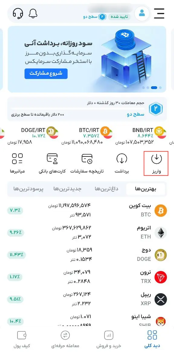 برای واریز و برداشت ریالی باید حداقل احراز هویت سطح یک را تکمیل کنید. با ارتقاء به سطح دو میتوانید سقف برداشتهای بالاتری داشته باشید.