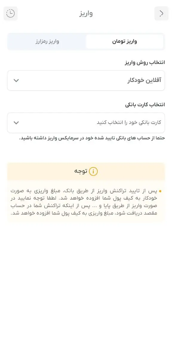 واریز فقط باید از حسابهای بانکی تأییدشده خودتان انجام شود. در صورت واریز از حساب فرد دیگر، مبلغ پس از کسر کارمزد بانکی به حساب مبدأ عودت داده خواهد شد.