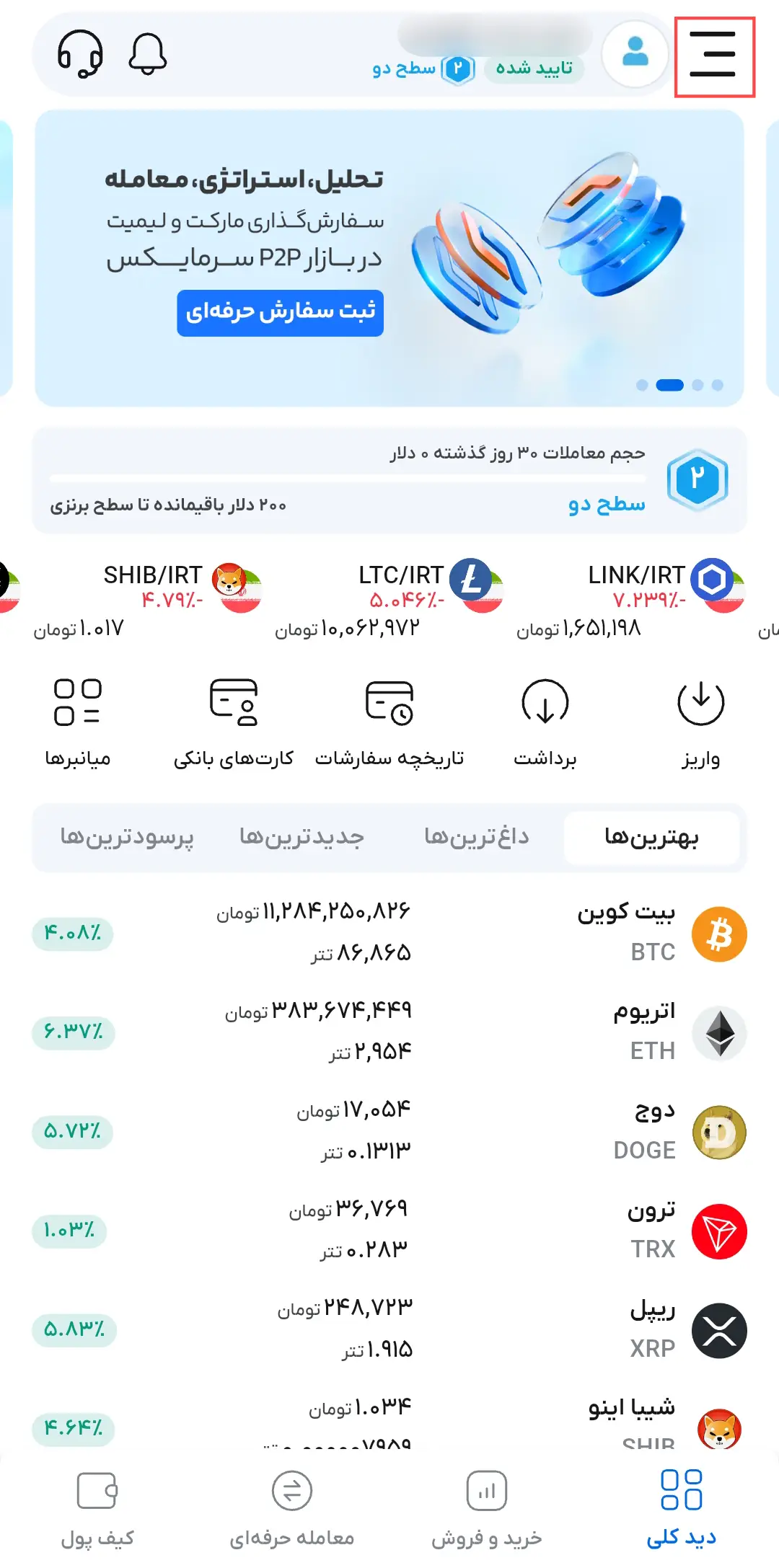 پس از نصب اپلیکیشن موبایل سرمایکس، مراحل ورود یا ثبت نام خود را تکمیل کنید. سپس، روی آیکن «سه خط» گوشه راست بالای صفحه ضربه بزنید و وارد بخش تنظیمات حساب کاربری خود شوید. در اینجا، گزینه «افراد زیرمجموعه» را انتخاب کنید.