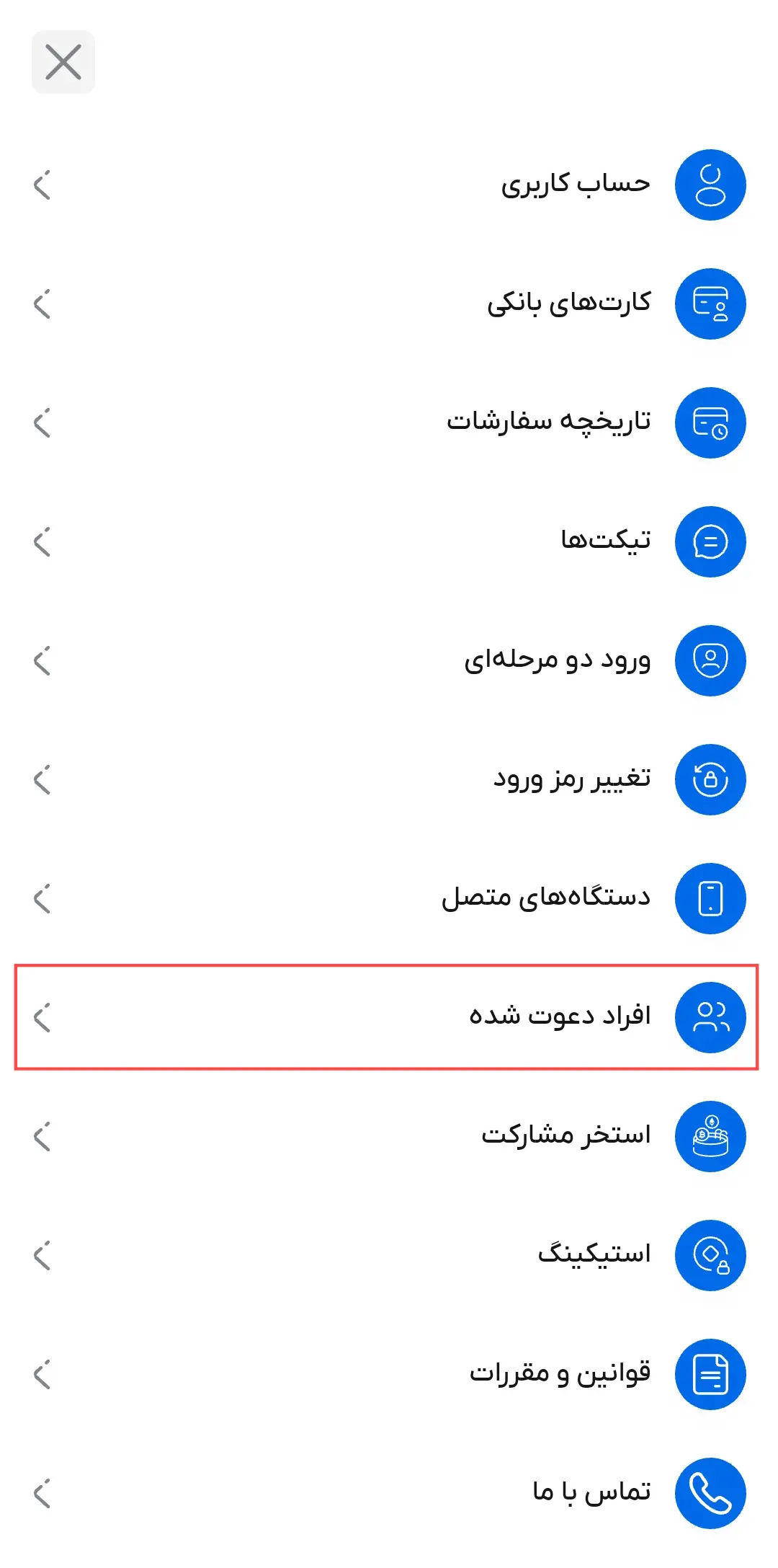 در اپلیکیشن موبایل، روی آیکن سهخط گوشه راست بالای صفحه بزنید، وارد تنظیمات حساب شوید و گزینه «افراد زیرمجموعه» را انتخاب کنید. در این قسمت کد دعوت شما نمایش داده میشود.