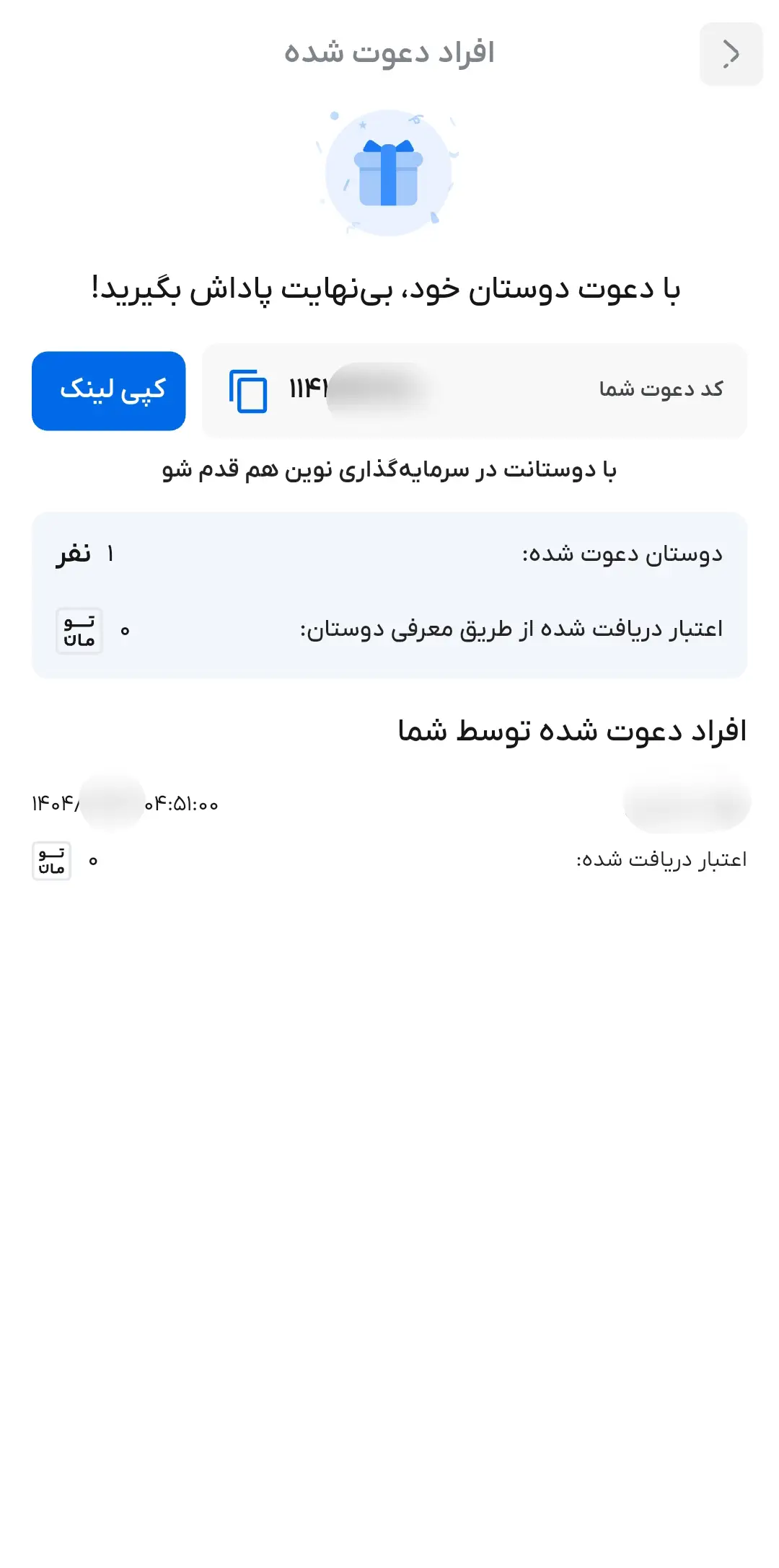 در اینجا، کد دعوت خود را مشاهده میکنید. آن را کپی کرده و با دوستانتان بهاشتراک بگذارید. در این بخش همچنین میتوانید تعداد دوستان دعوتشده و اعتبار دریافتی از طریق معرفی آنها را مشاهده نمایید.