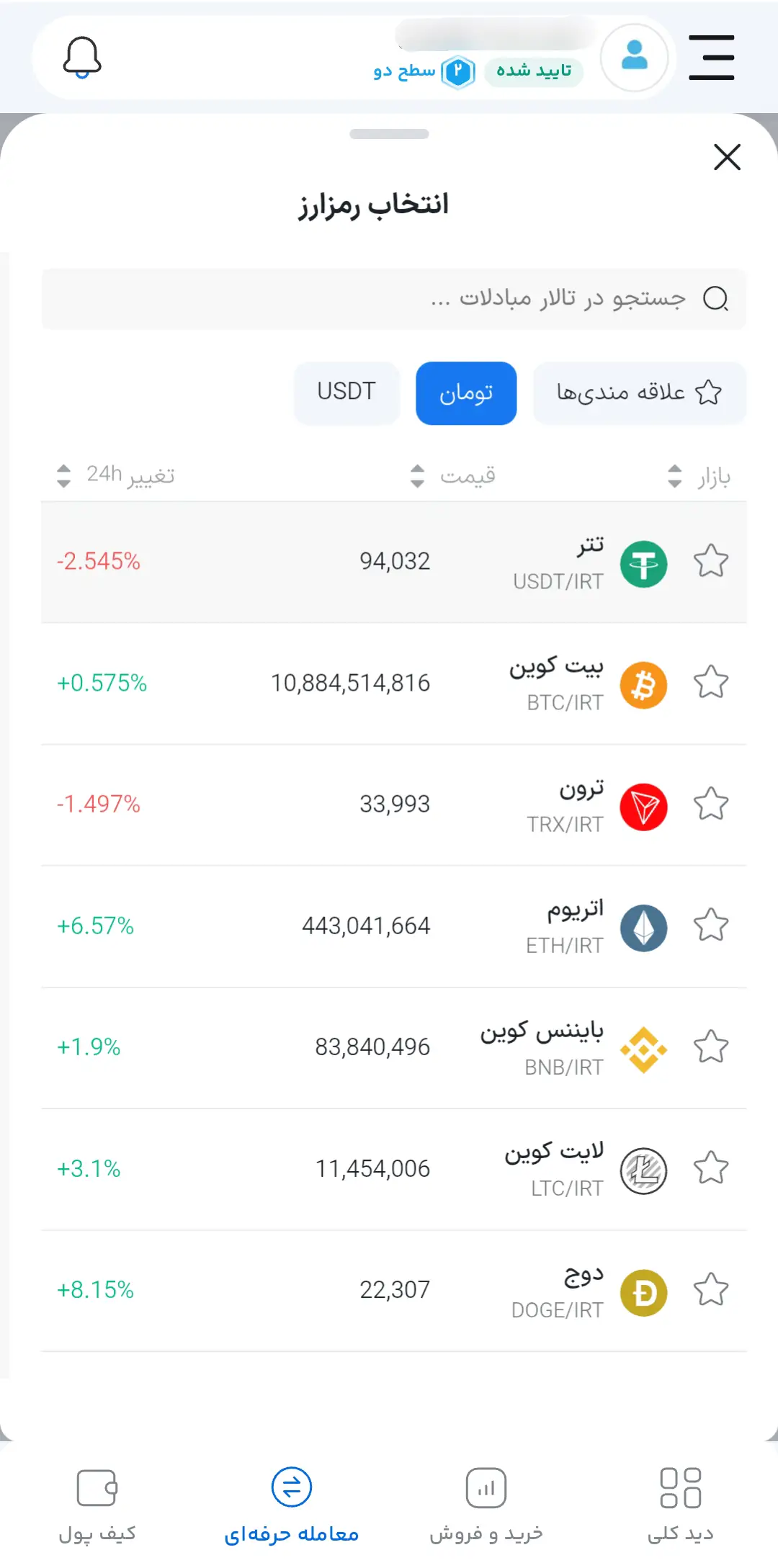 ۲. اکنون از سمت راست و بالای صفحه، میتوانید بازارهای تتری و تومانی و ارز دیجیتال مورد نظر برای ترید را انتخاب کنید. برای این کار، میتوانید نام ارز دیجیتال مورد نظر را در قسمت «جستجو در تالار مبادلات…» جستجو کرده یا پس از انتخاب بازار «تومان» یا «USDT»، آن را از لیست موجود انتخاب کنید: