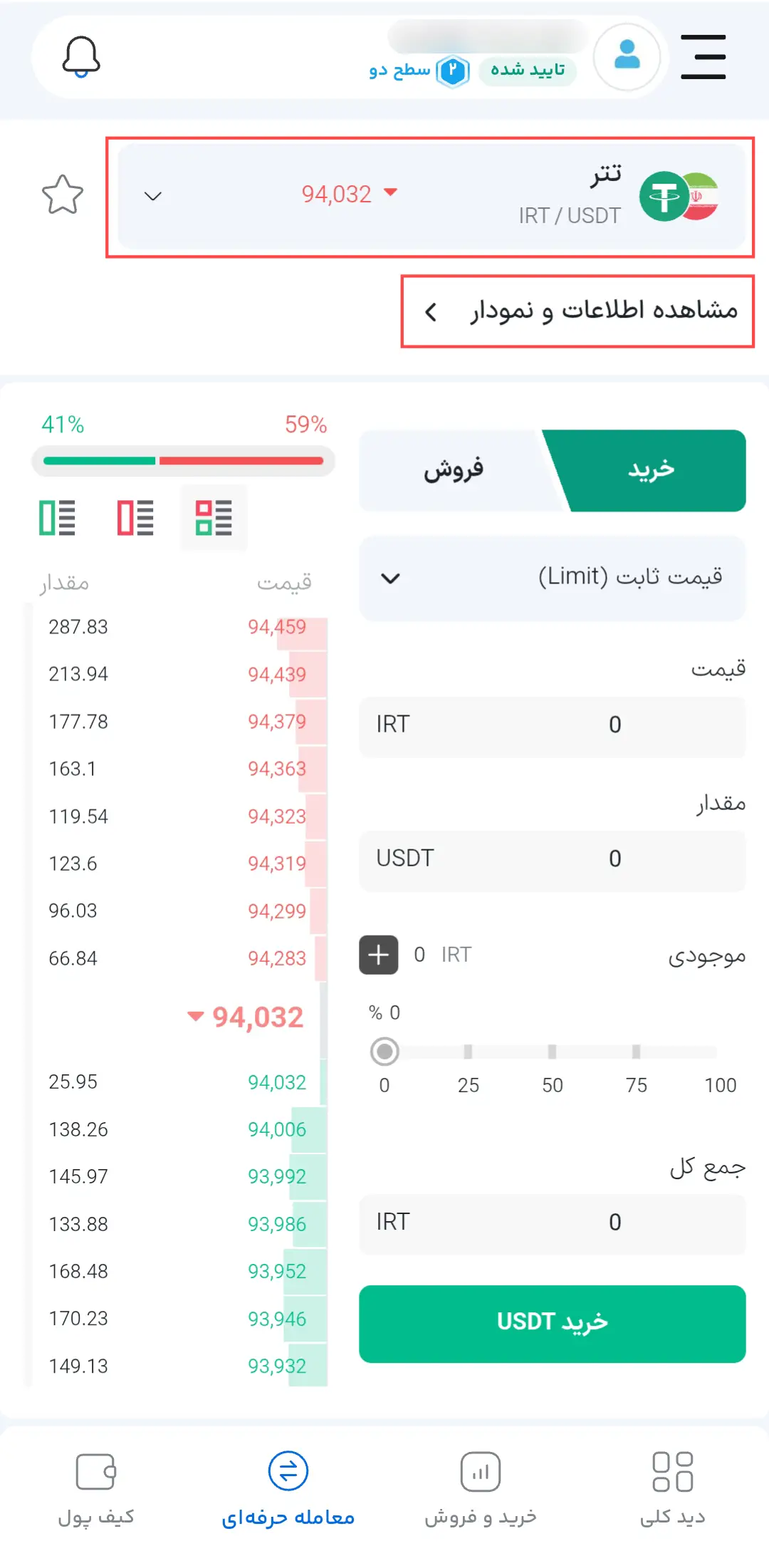 ۲. اکنون برای ثبت سفارش یکی از انواع مدلهای سفارشگذاری یعنی با قیمت ثابت یا با قیمت بازار، کافی است ابتدا از منوی بالا، «خرید» یا «فروش» را انتخاب کنید. سپس، مدل سفارشگذاری را انتخاب کرده و جزئیات دیگر مربوط به قیمت (در سفارش لیمیت) و مقدار را وارد کنید. در آخر، با ضربه زدن روی «خرید» یا «فروش» در پایین صفحه، سفارش شما ثبت میشود.