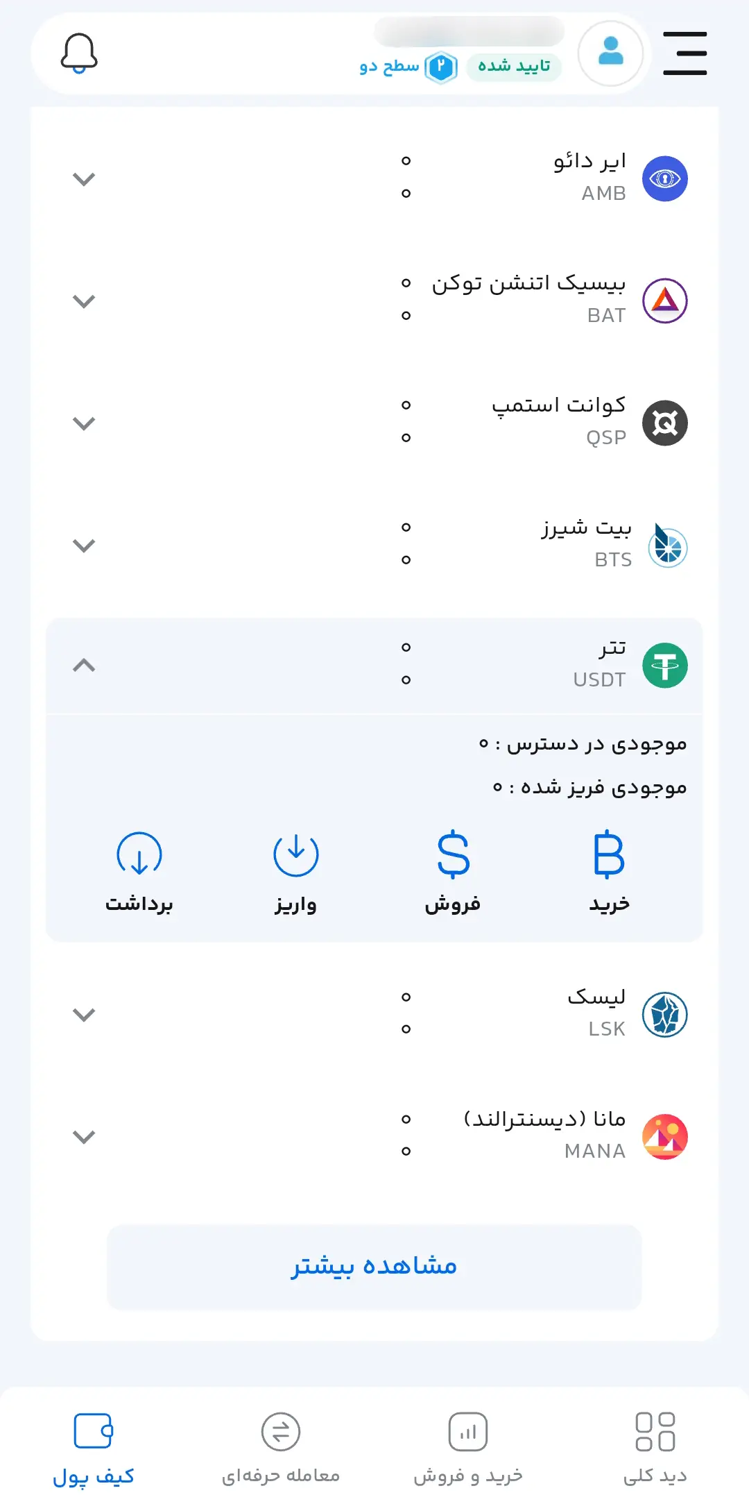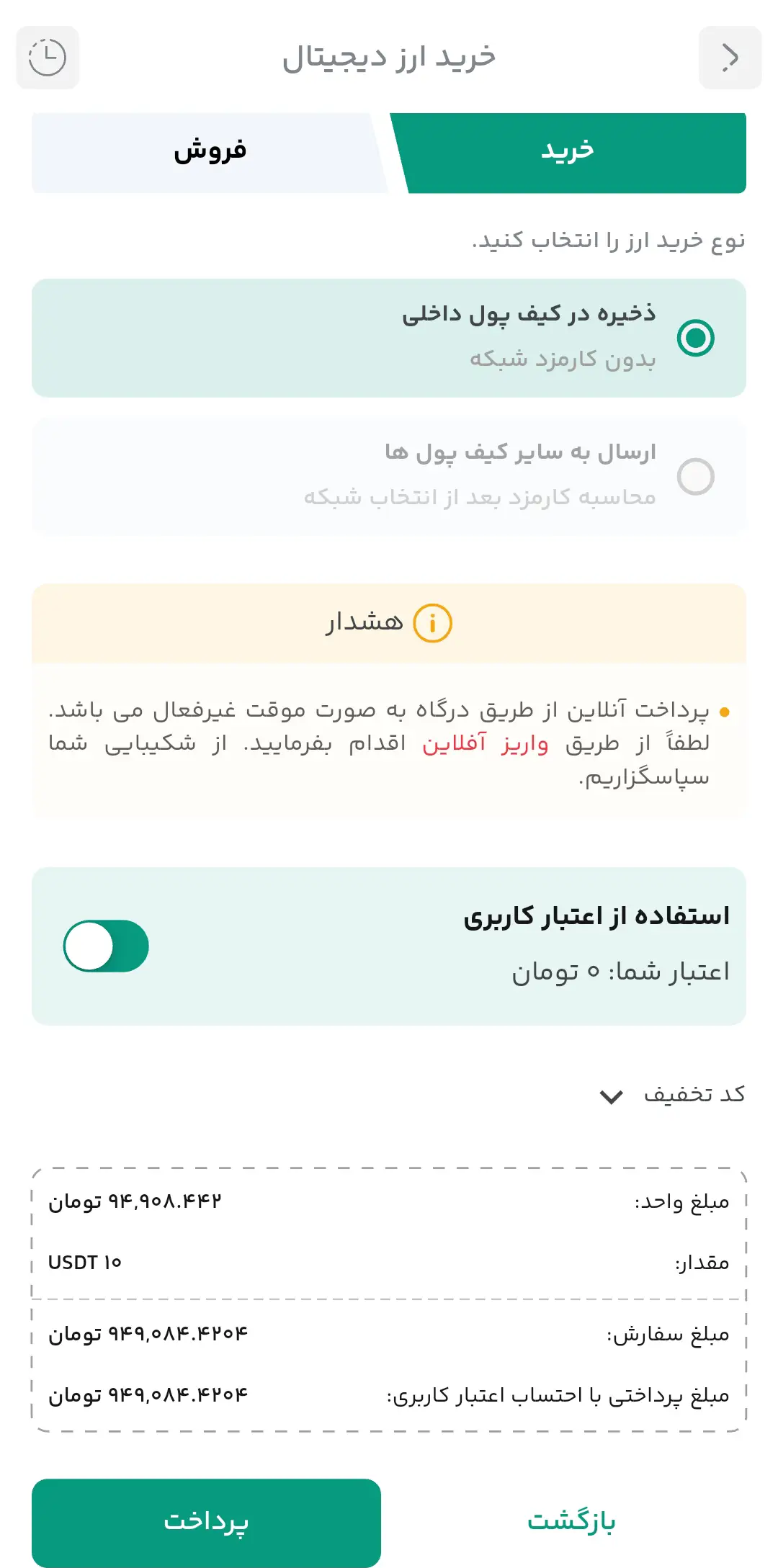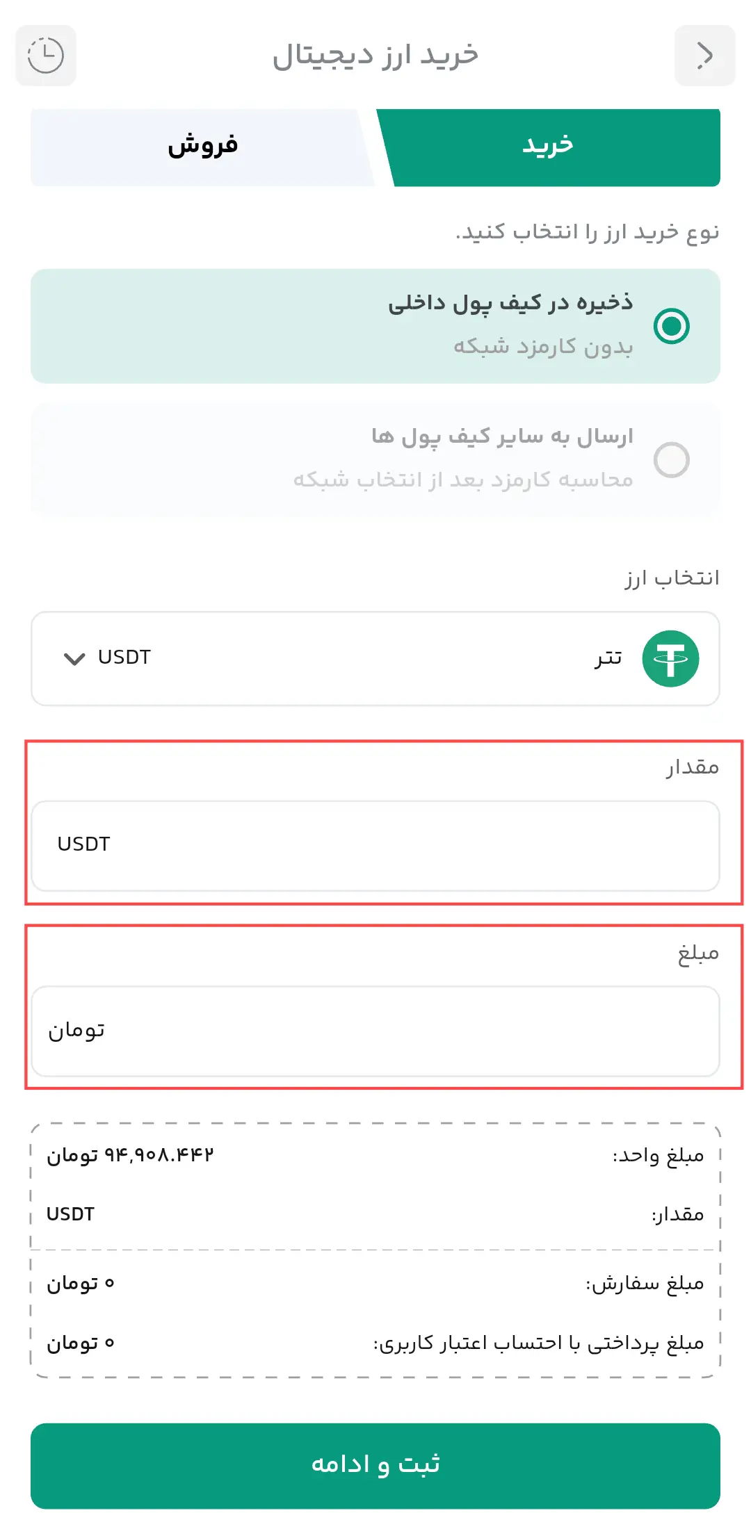 با ضربه زدن روی «ثبت و ادامه»، مبلغ نهایی واریز مشخص میشود. روی «پرداخت» ضربه زده و پس از واریز مبلغ، تترهای خریداریشده را در کیف پول خود در سرمایکس مشاهده میکنید.