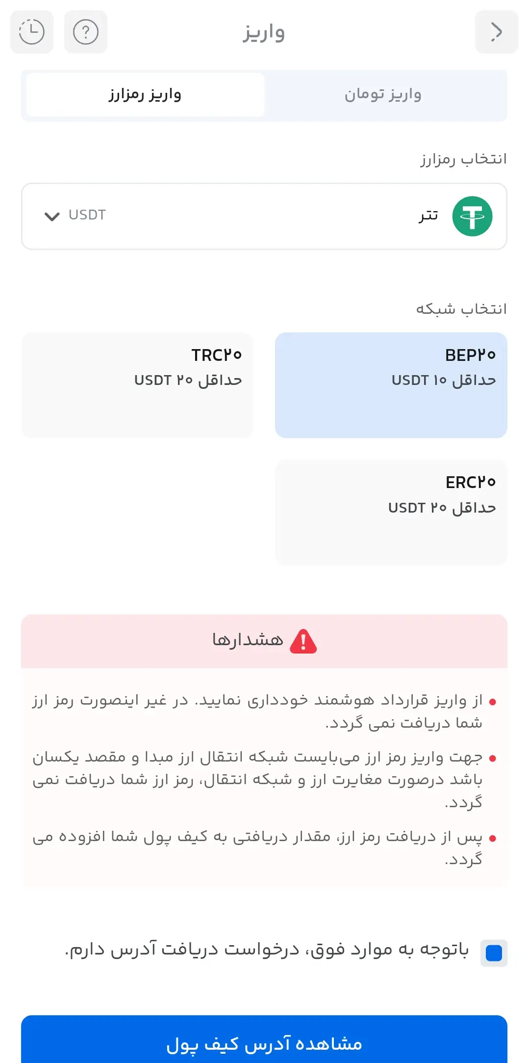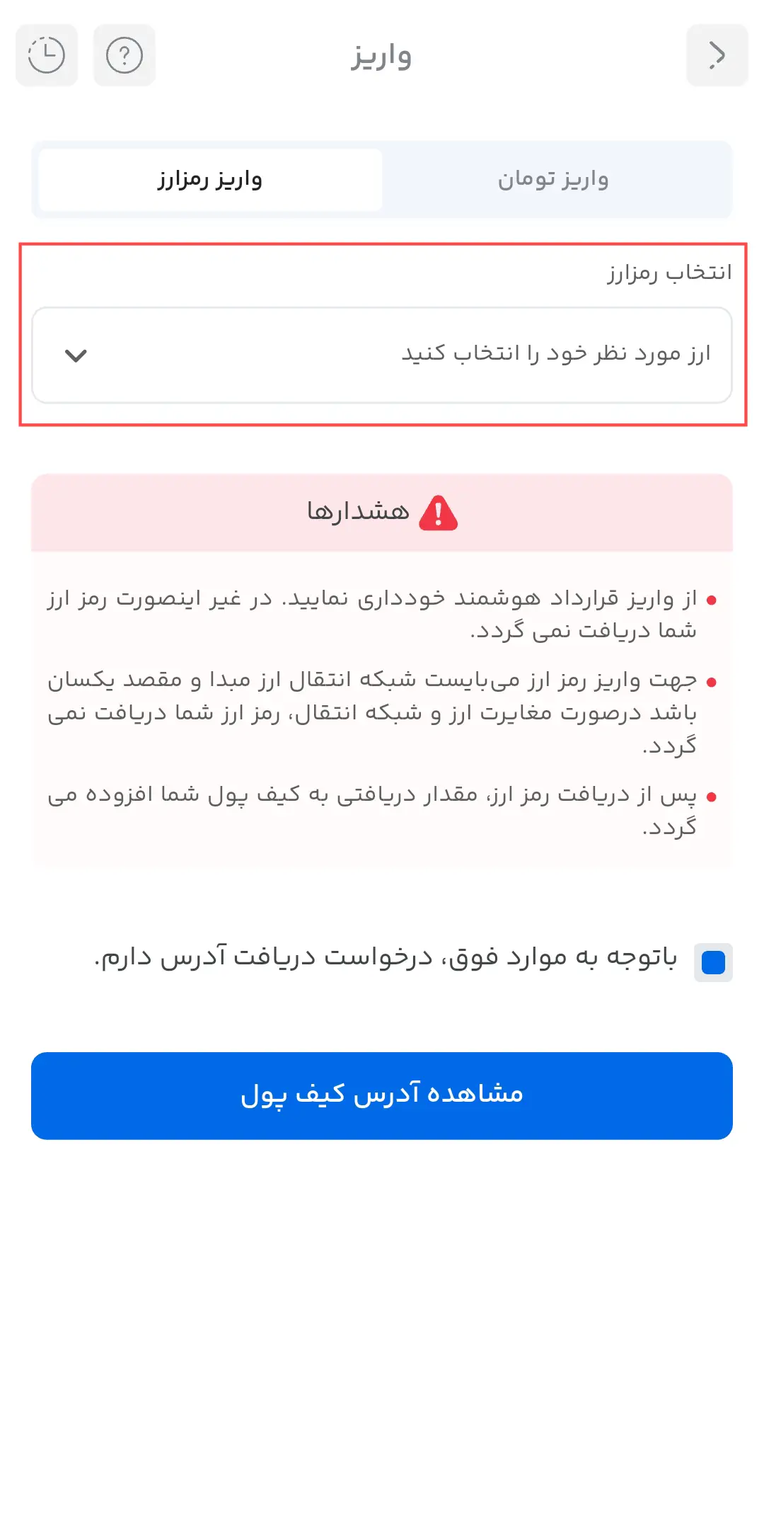 در ادامه، از پنجره پایین، روی «واریز رمزارز» کلیک کنید. اکنون در کادر اول، ارز دیجیتال مورد نظر برای واریز را انتخاب کرده و پس از تیک زدن گزینه امنیتی درخصوص واریز، روی «مشاهده آدرس کیف پول» کلیک کنید. اکنون کافی است ارز انتخابی خود را به آدرس نمایشدادهشده واریز کنید.