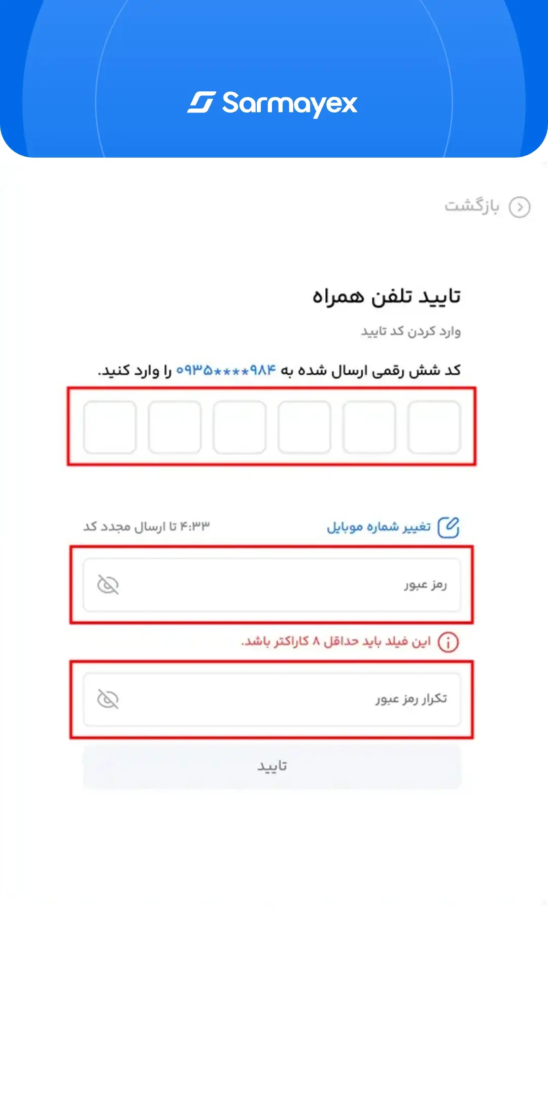 اکنون یک کد تأیید به شماره موبایلتان ارسال میشود که کافی است آن را در کادر اول وارد کرده و سپس یک رمزعبور قوی برای حسابتان انتخاب کنید. دقت داشته باشید که این رمزعبور باید حداقل ۸ کاراکتر و حاوی یک کاراکتر ویژه بههمراه حروف انگلیسی کوچک و بزرگ باشد. در کادر بعد نیز مجدداً این رمز بعبور را وارد کنید. در نهایت، با ضربهزدن روی دکمه «تایید»، حساب کاربری شما در اپلیکیشن موبایل سرمایکس ساخته میشود.